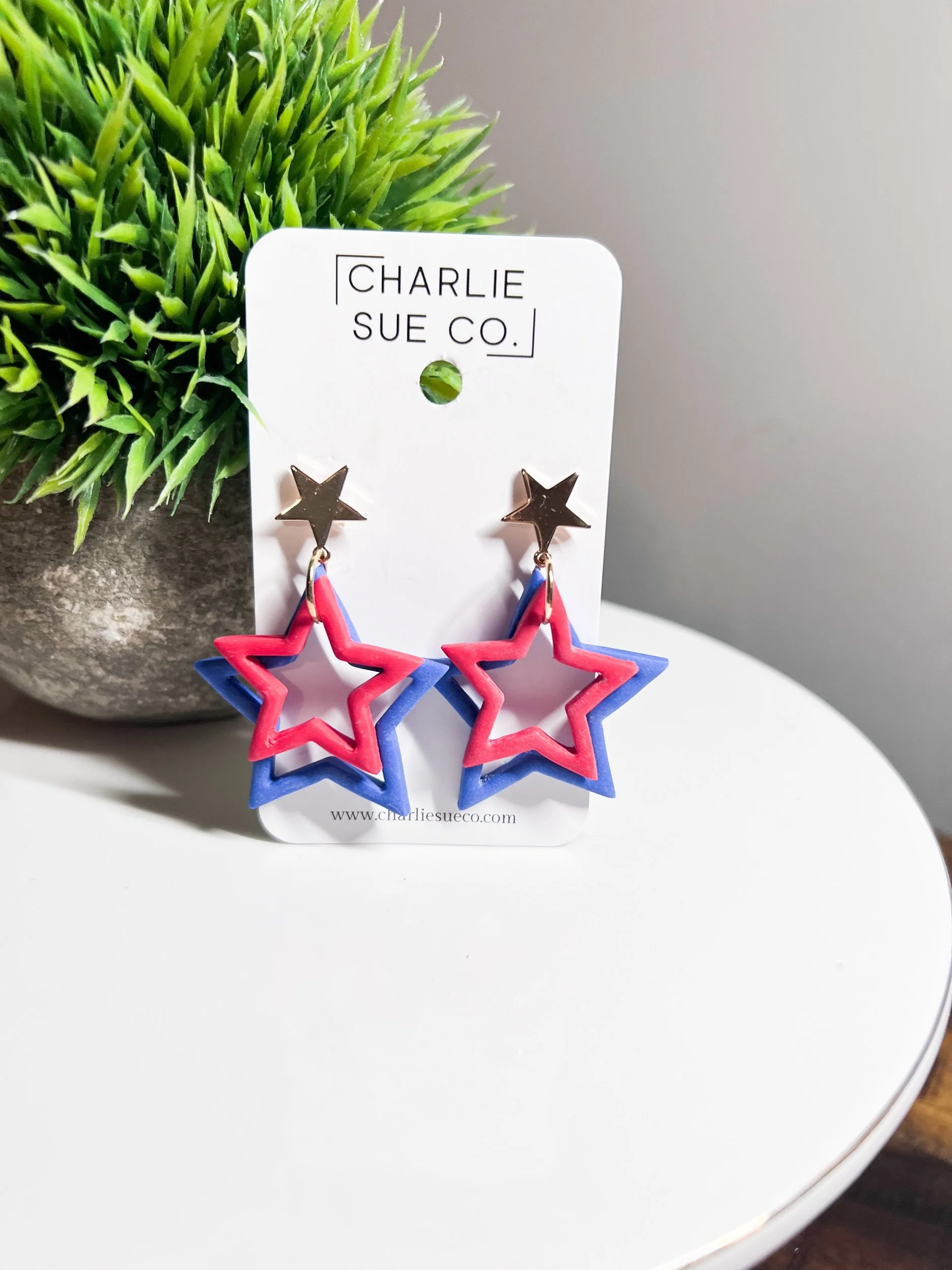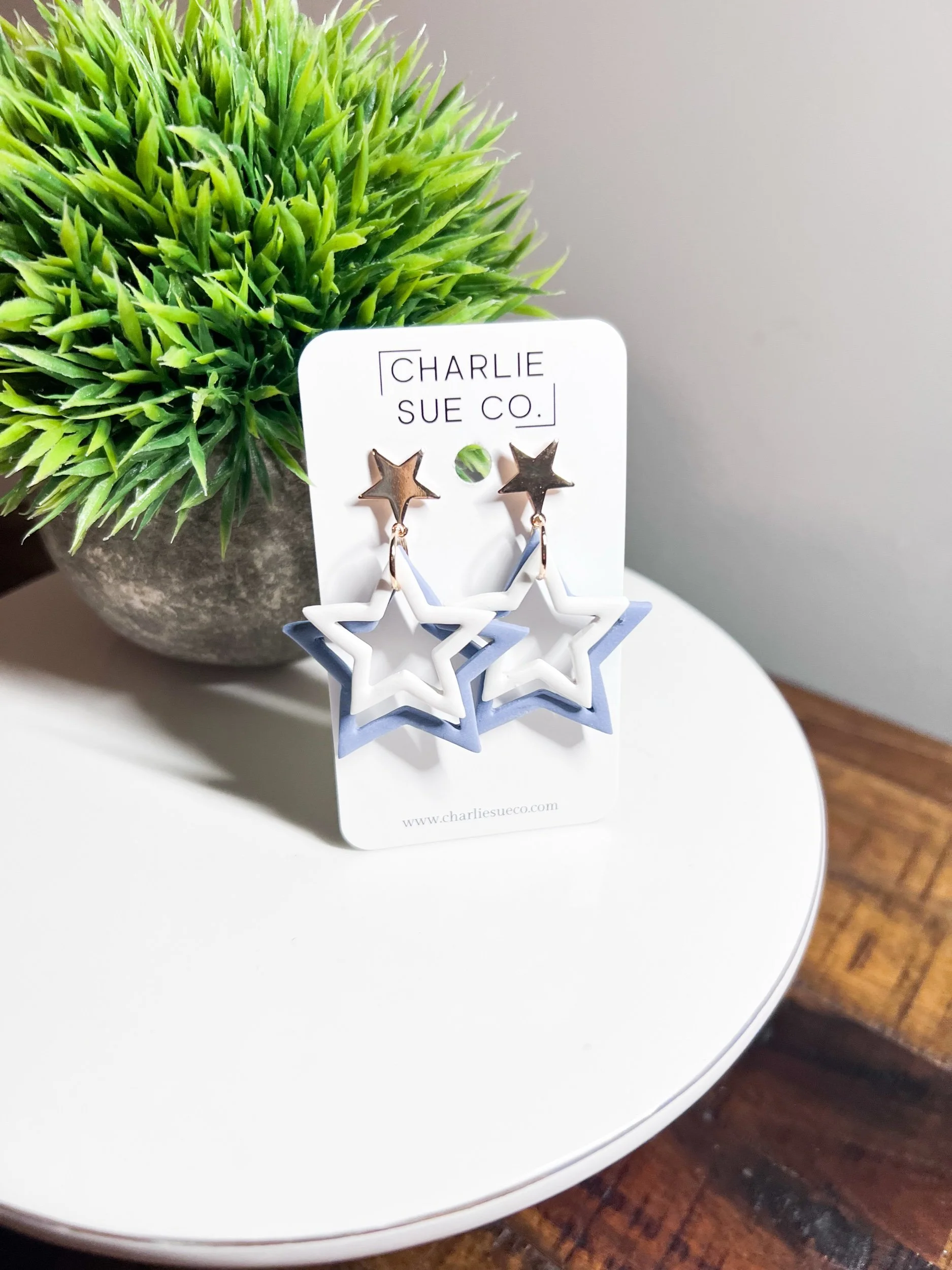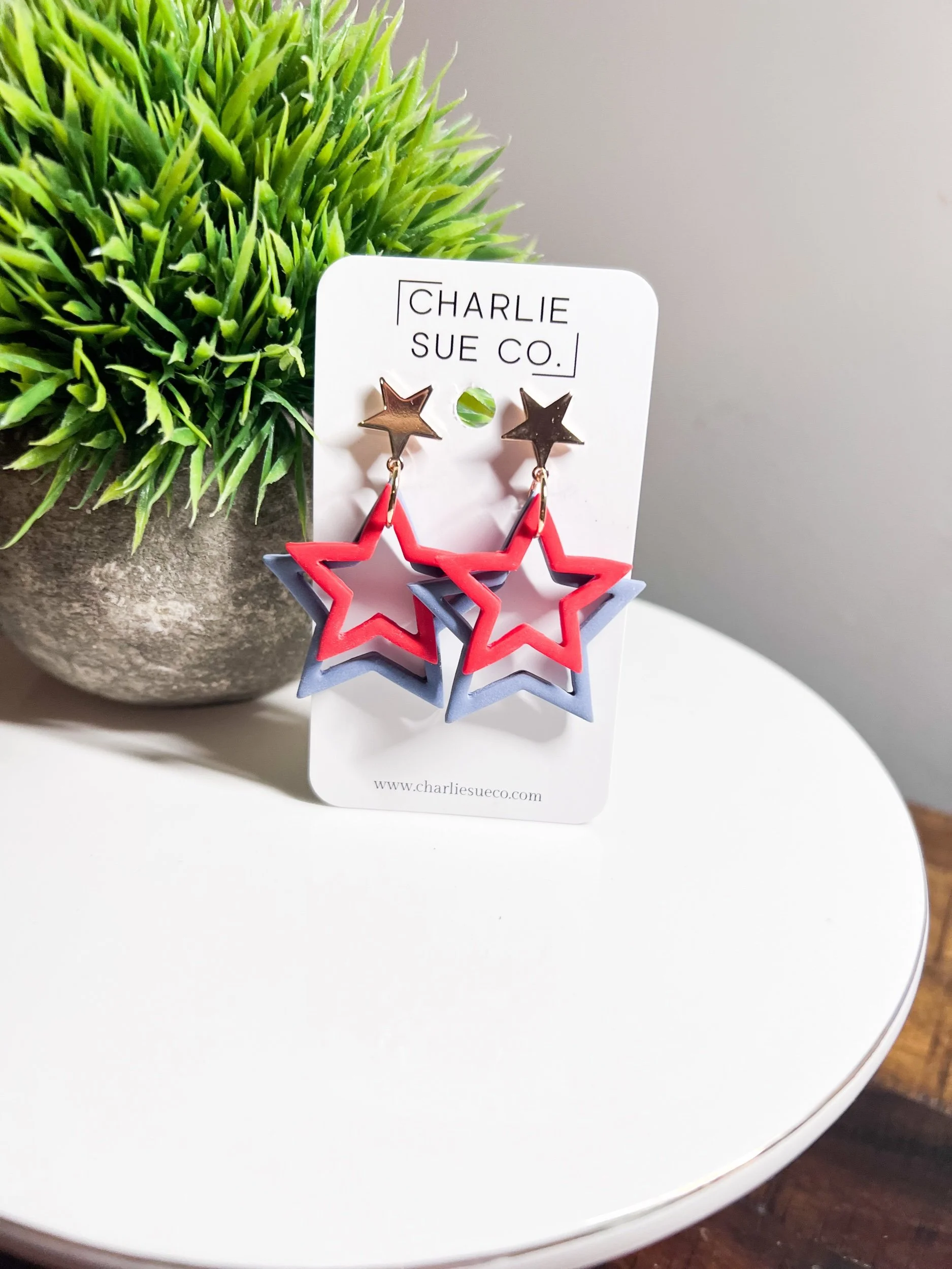 Shop › Double Star Dangle Image 1 of 3 Image 2 of 3 Image 3 of 3 Double Star Dangle $20.00 Color: Blue/White Red/Denim Red/Blue Quantity: Add To Cart Added!